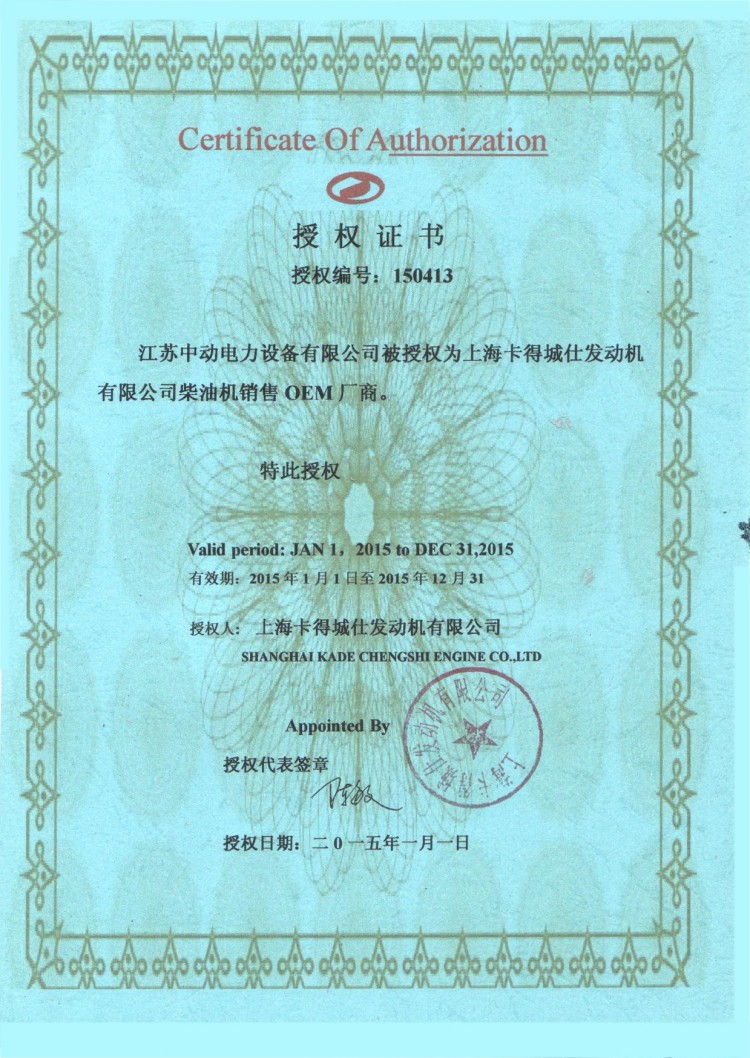 上??ǖ贸鞘税l(fā)動機(jī)有限公司授權(quán)江蘇中動電力設(shè)備有限公司作為柴油機(jī)配套商