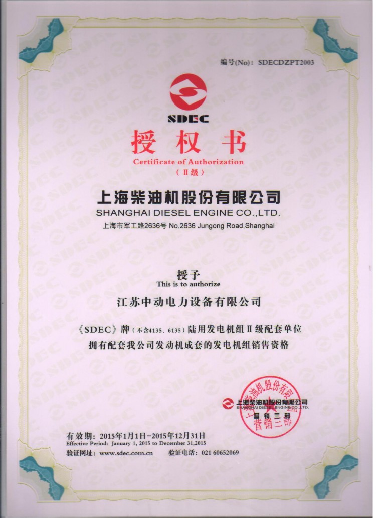 上海柴油機股份有限公司授權江蘇中動電力設備有限公司作為柴油機配套商